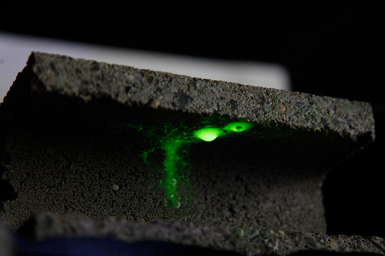 調査方法は簡単。専用の調査液を構造物の上方から下方に流し、紫外線を当てると発光するため、的確に雨漏りの部位を発見できます。
